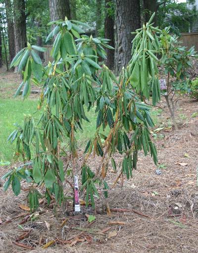 Drooping leave on rhododendron caused by cold weather. Phytophthora root rot is caused by a fungus in very wet soil. Avoid plants that lack normal green color, appear wilted in the morning, or have dark, discolored roots. Phytophthora ramorum symptoms on rhododendron consist of leaf blight and shoot dieback. Apparently, fertilizing after your rhododendron has finished flowering promotes more leaves at the expense of next year's.
